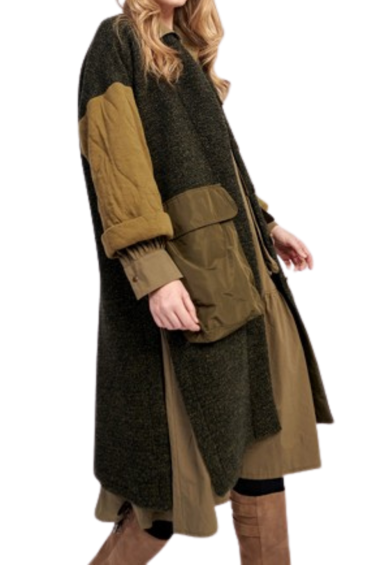 This modern maxi coat delivers comfort and character with a brushed khaki knit and quilted sleeves for textural contrast. Designed with a loose, boxy fit and deep side slits, it layers effortlessly over casual and dressy looks alike. Oversized pockets and a full placket complete the utilitarian edge.Β  Boxy silhouette, maxi length, loose drop shoulder bracelet sleeve, full button placket, oversized patch front pockets, side slits, unlined.