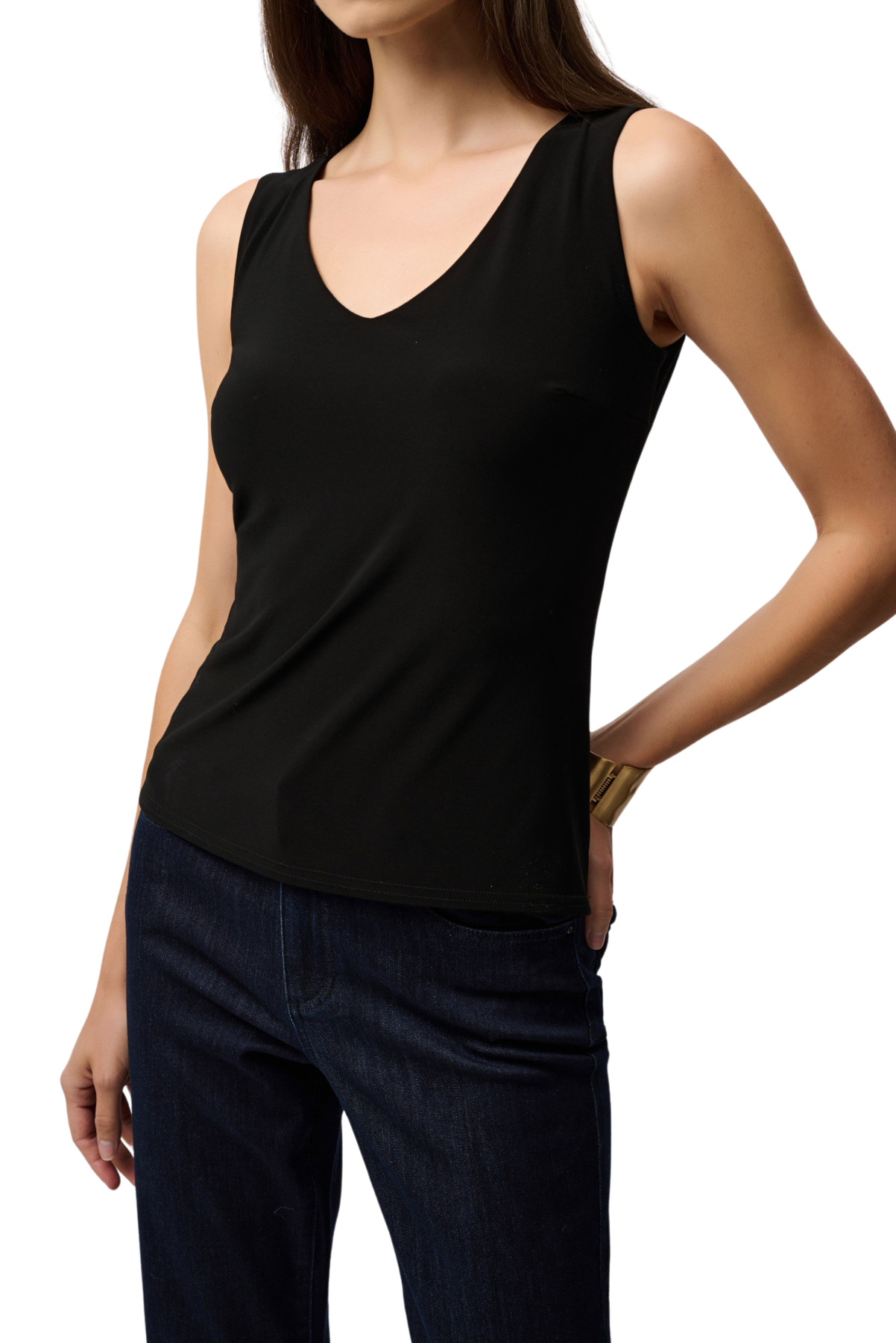 This sleek camisole features a silky knit and alluring V-neckline at both the front and back of this garment. Styled in a shoulder-baring silhouette with a double-layered front. A chic basic that's definitively a wardrobe staple.