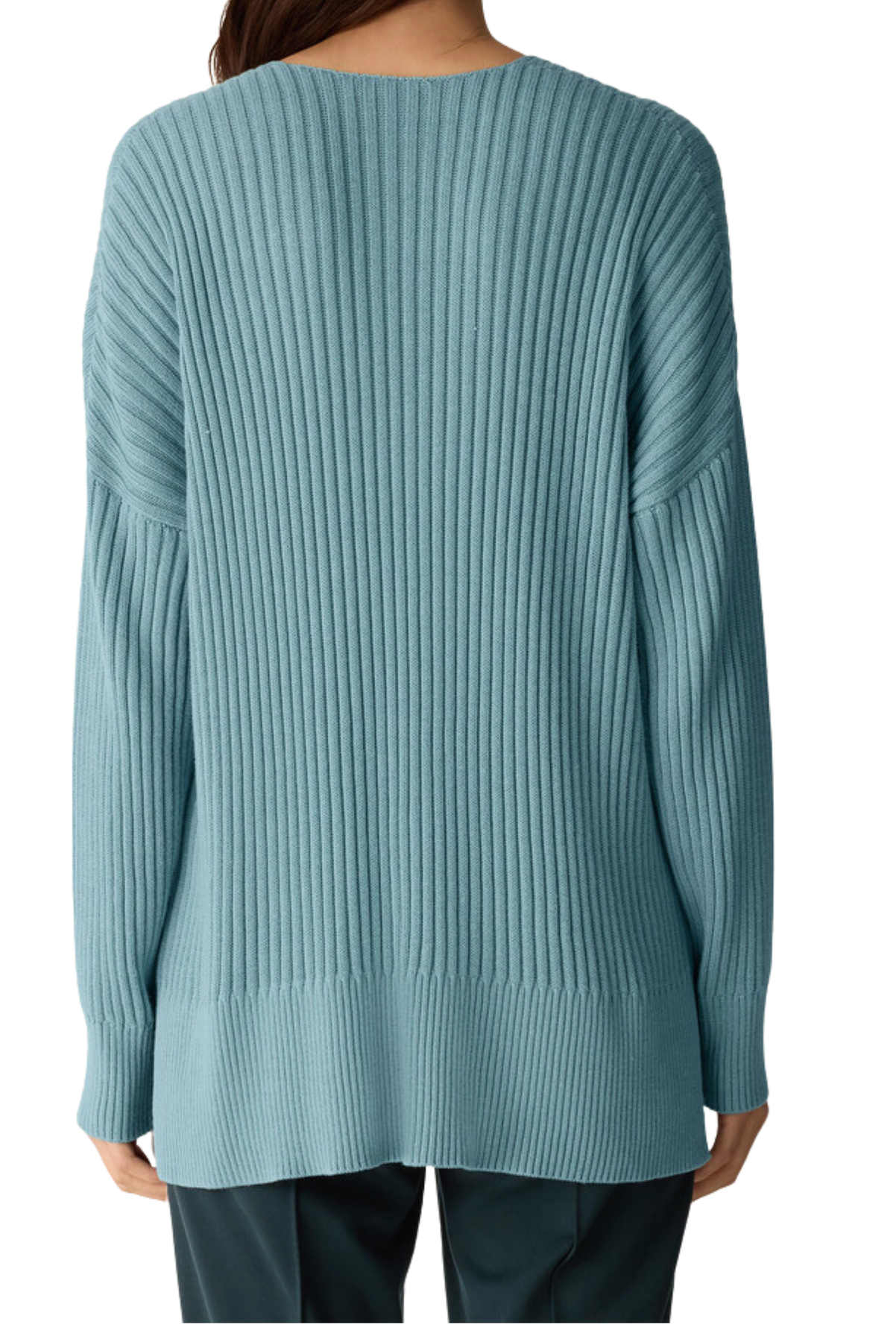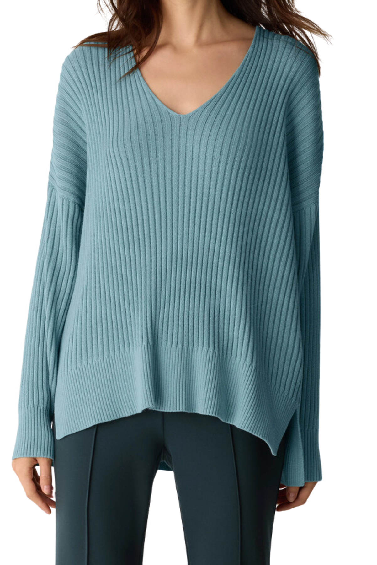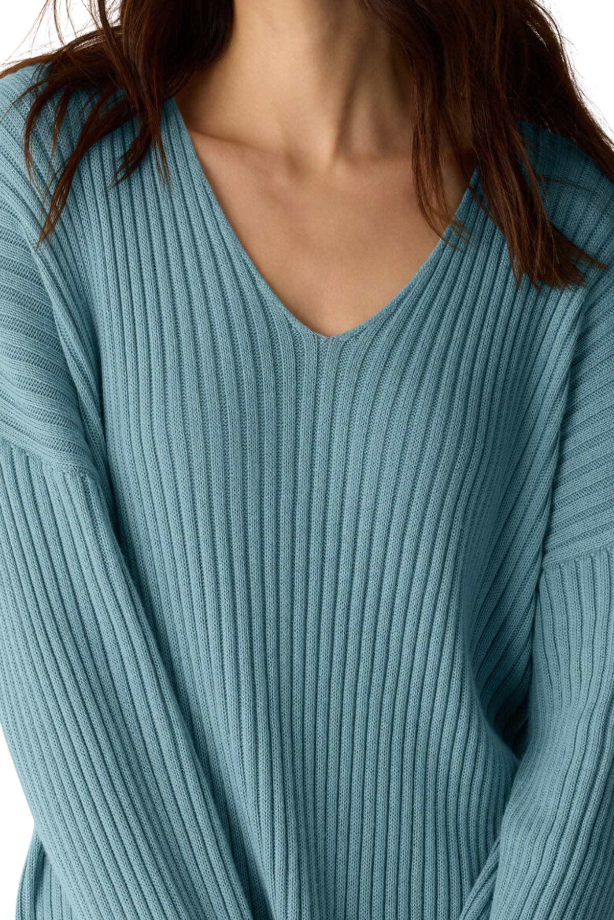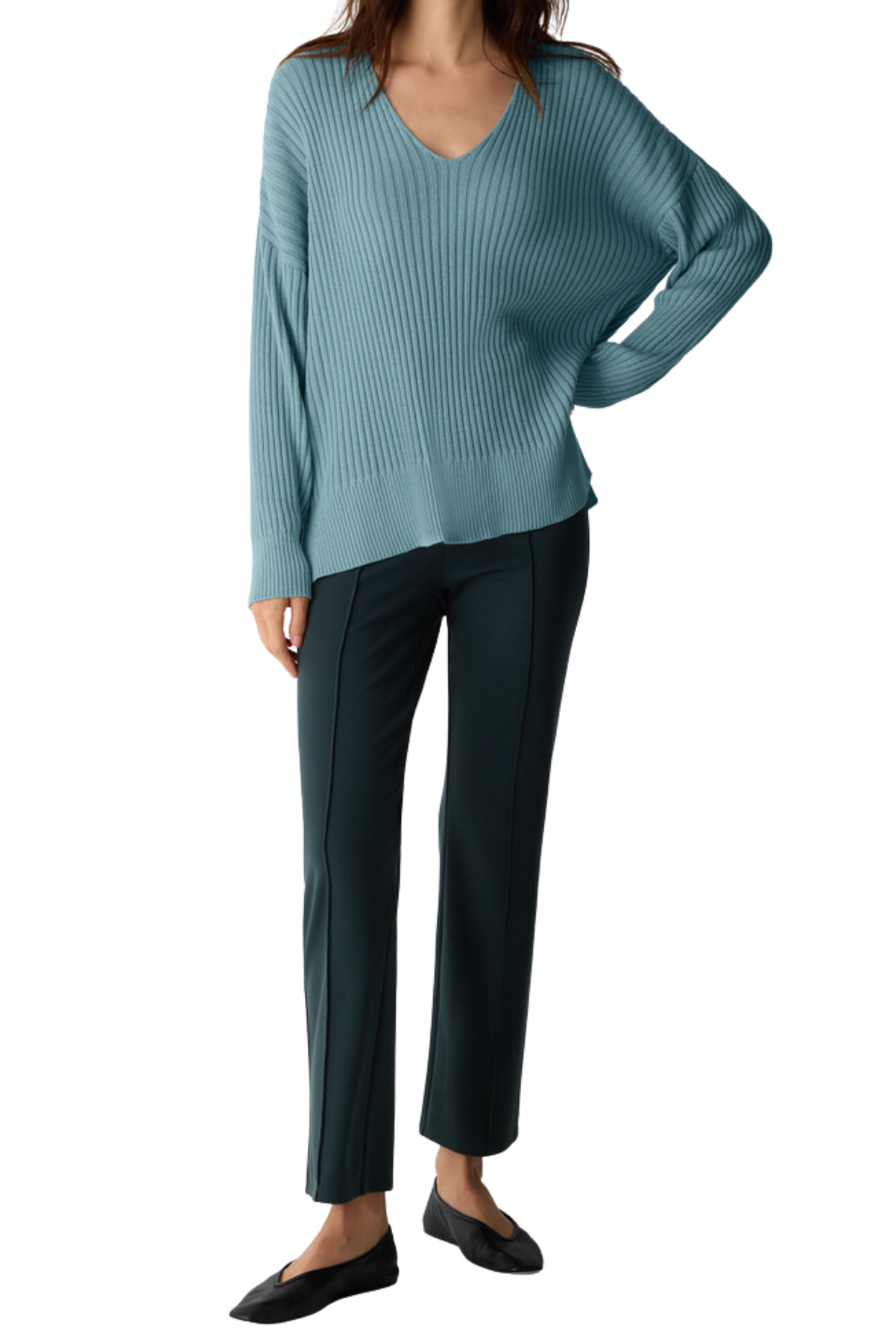 An easy V-neck top with a soft feel, in a cozy blend of Tencel™ Lyocell and cotton grown using regenerative farming methods. Close at the shoulders, wider at the hem. A silhouette that fits the body with ease. V-neck, drop shoulder. 3 1/2-inch side slits.