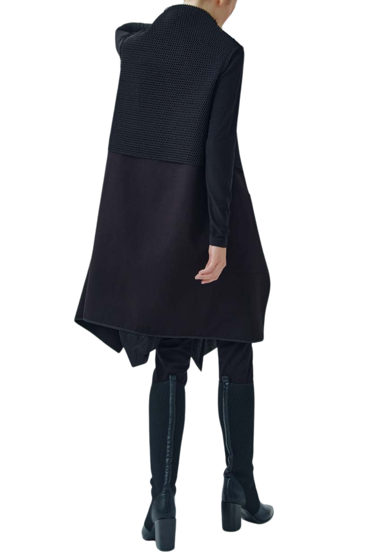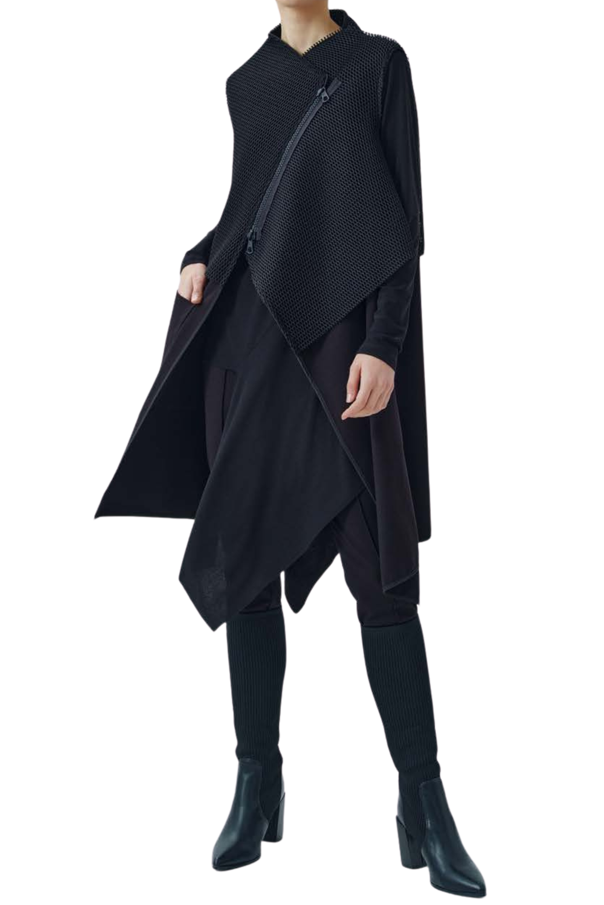 Stylish black jersey W-coat with mesh details, V-shaped fronts embellished with diagonally sewn zip gives the w-coat a stand out touch.Ā