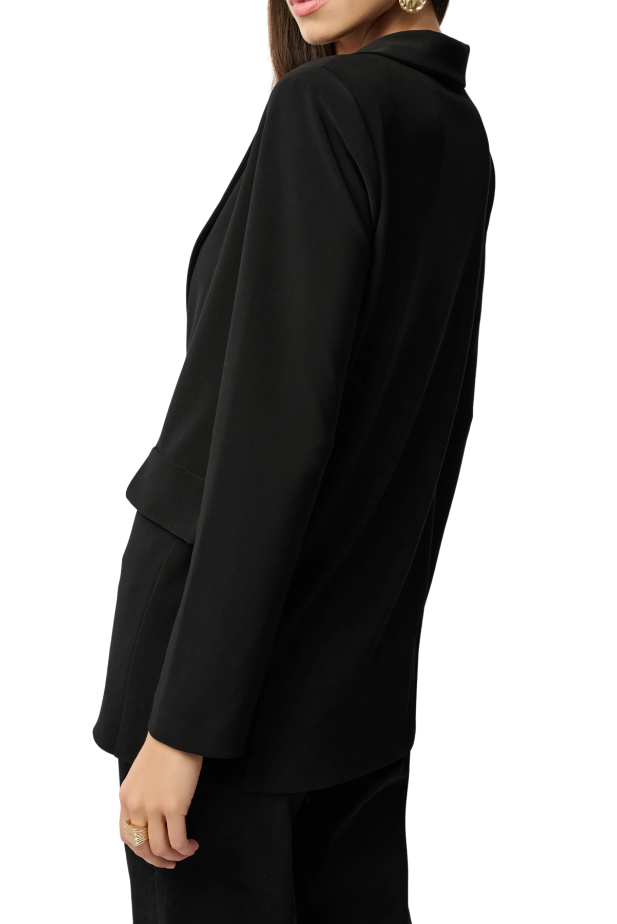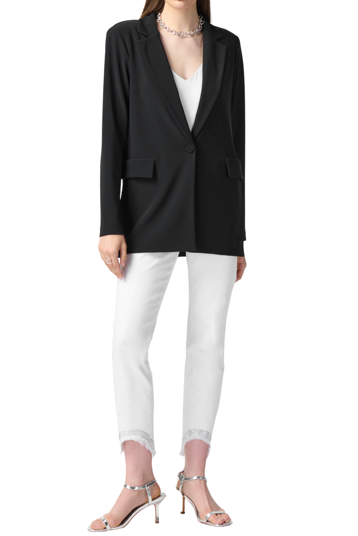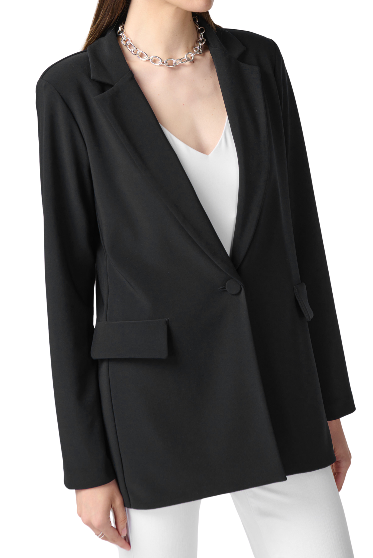 This easy-to-wear blazer will pull any outfit together. Cut from a luxurious silky knit fabric with a slightly longer hemline in a straight fit, this blazer is a fabulous addition to any wardrobe. This chic blazer also has a notched collar, long sleeves, two front pockets, and a front button closure.