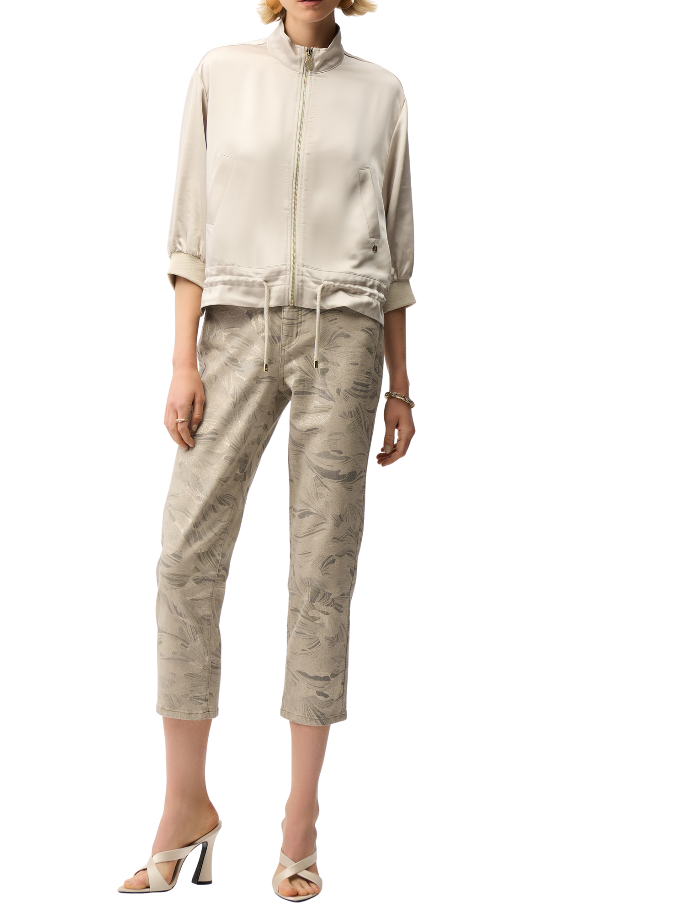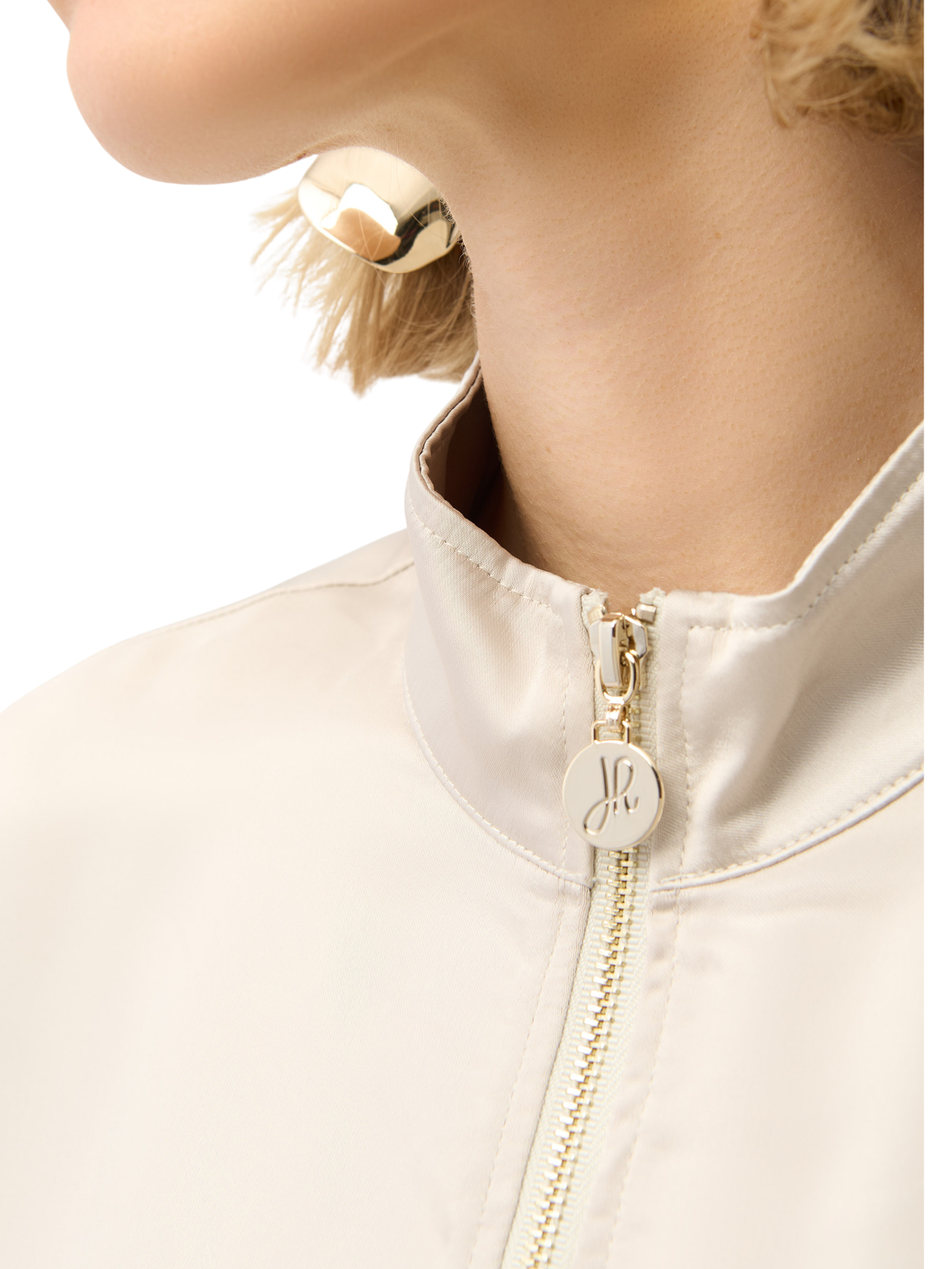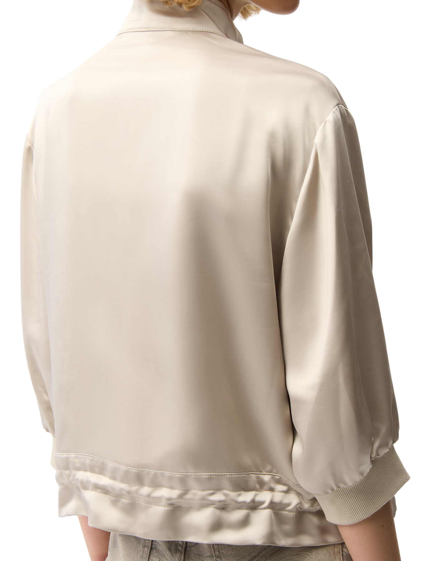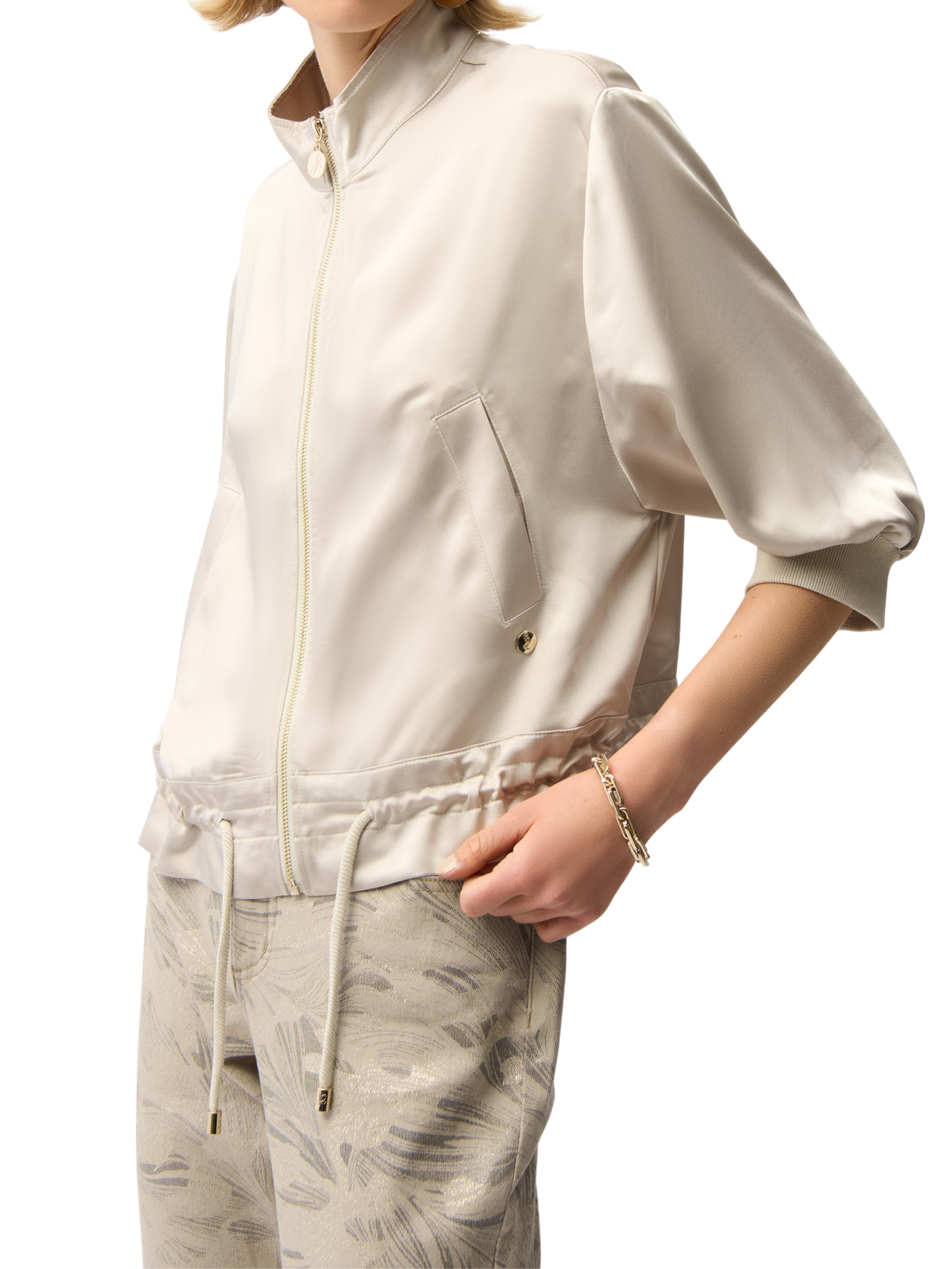 This satin boxy blouson jacket features a funnel neck collar, drop shoulder three-quarter sleeves with ribbed cuffs, and a drawstring hem. Finished with a metal zipper front closure and faux pockets, it offers a modern, relaxed fit.