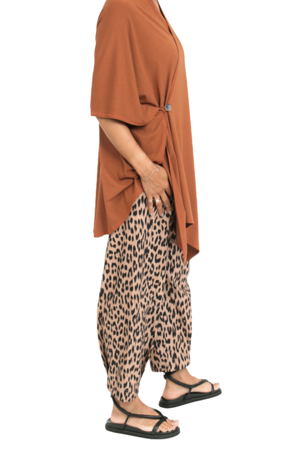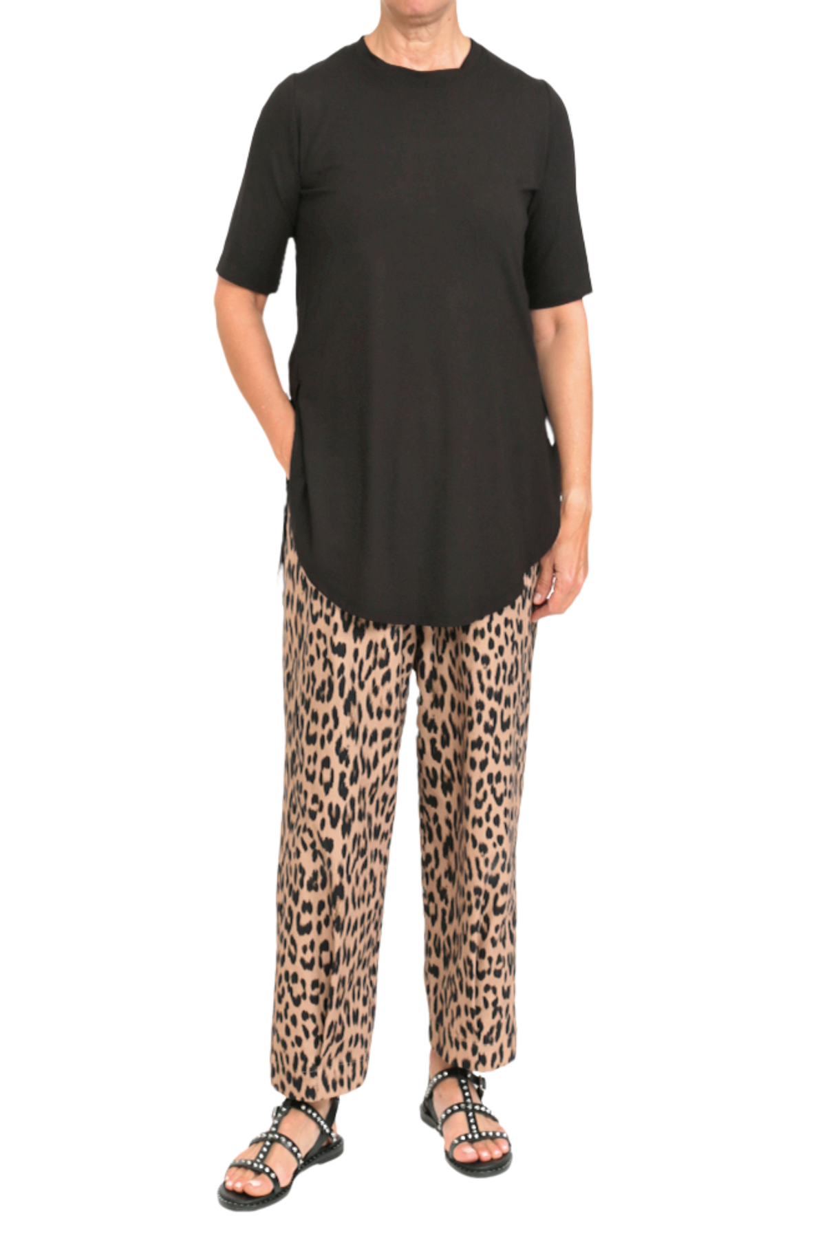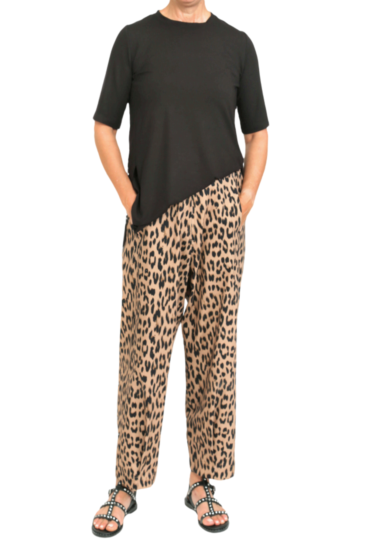 Welted front zipper detail. Elastic back waistband. Pleats on front and back hem. Rolled forward inseam pockets.