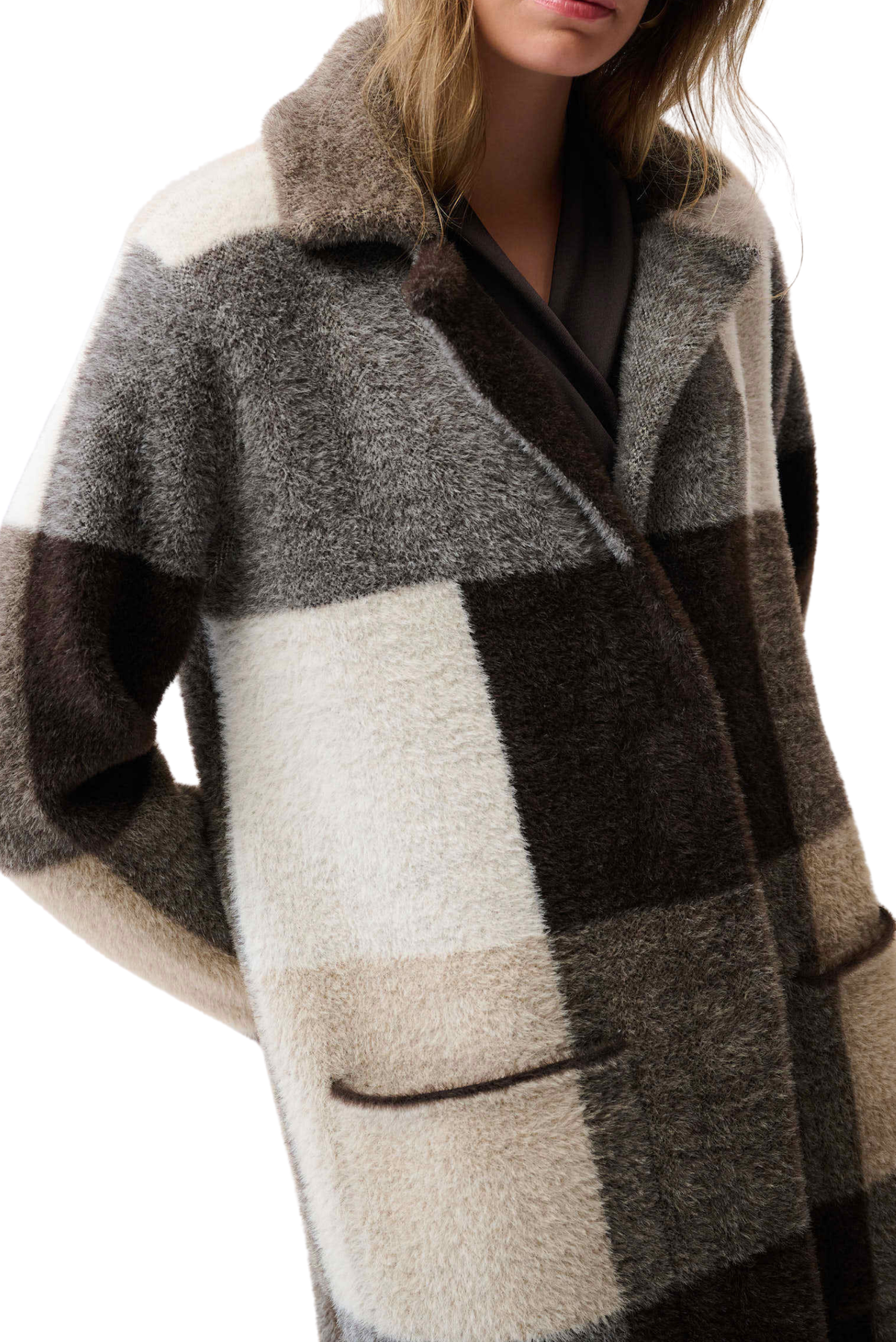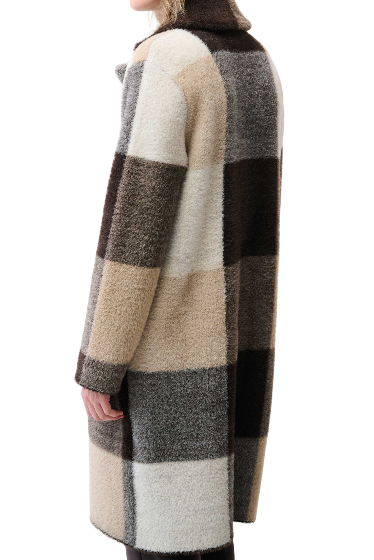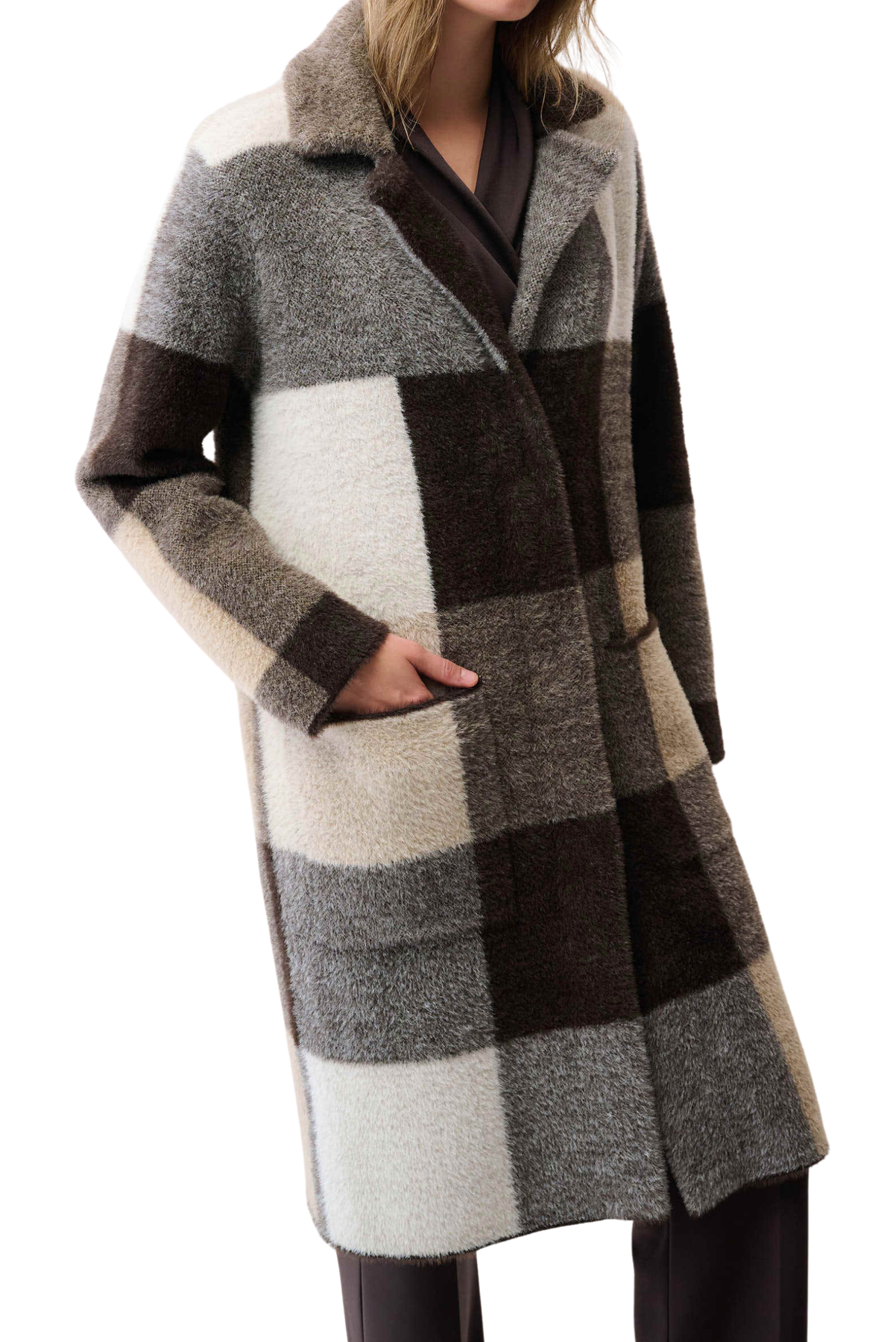 This feather yarn sweater coat features a relaxed fit with a notched collar and long sleeves. Patch pockets and a snap closure add functional elegance to the piece, making it an easy yet sophisticated layering option.