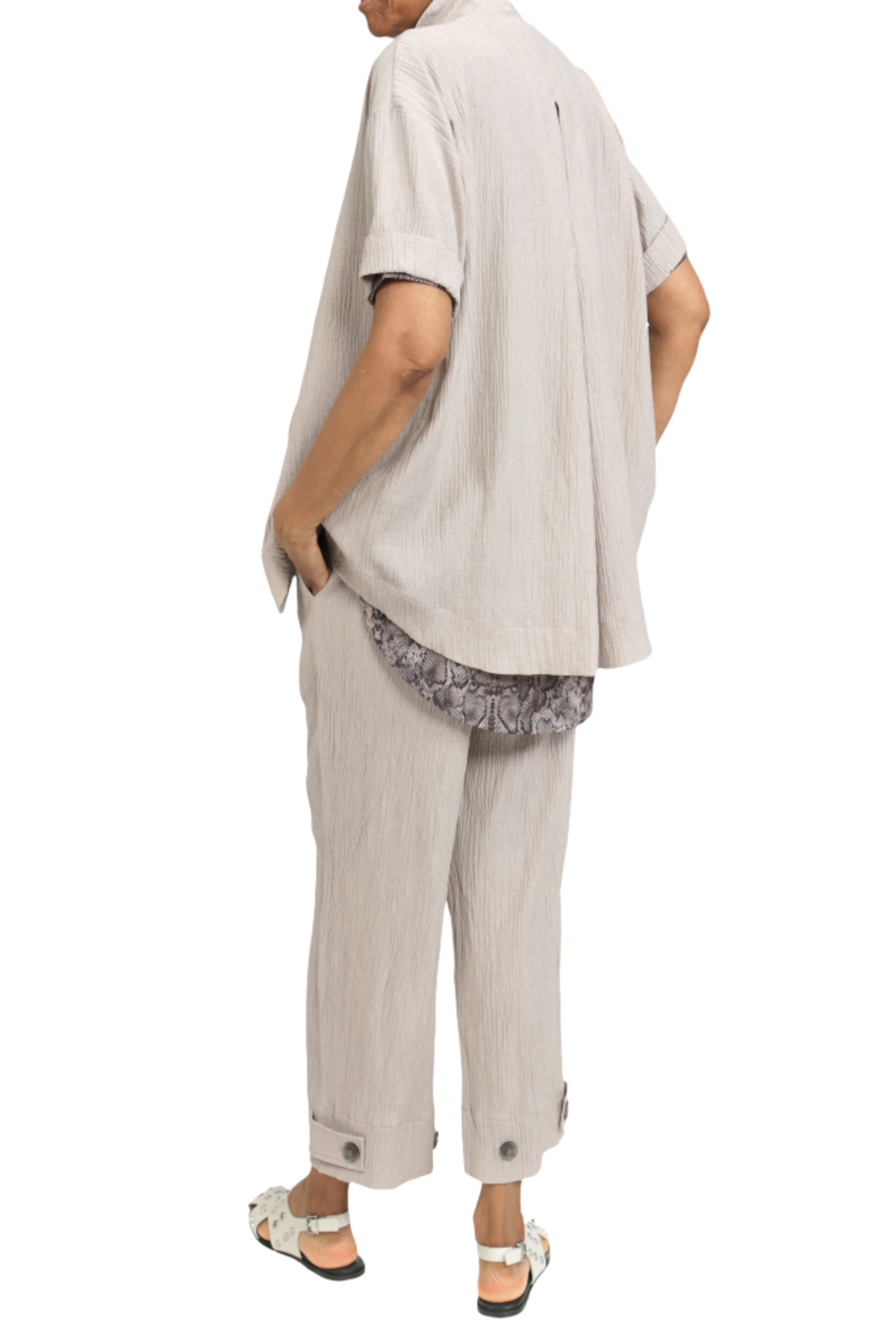Slash pockets.  Elastic back waist.  Button detail on wide hems swap between wide and lantern shape.