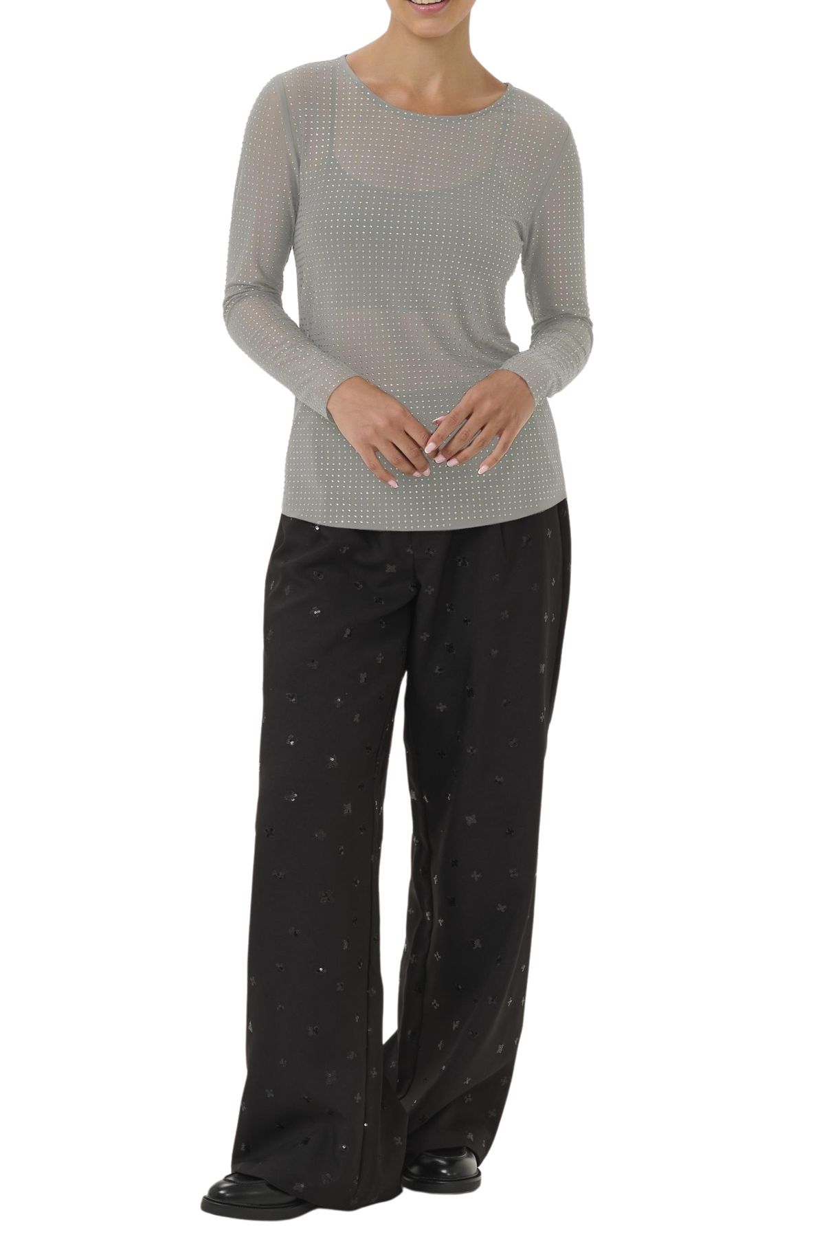 This mesh long sleeve top features a fitted silhouette and a round neckline. The fabric has a sheer appearance and is decorated with a uniform grid of small studs across the entire style.