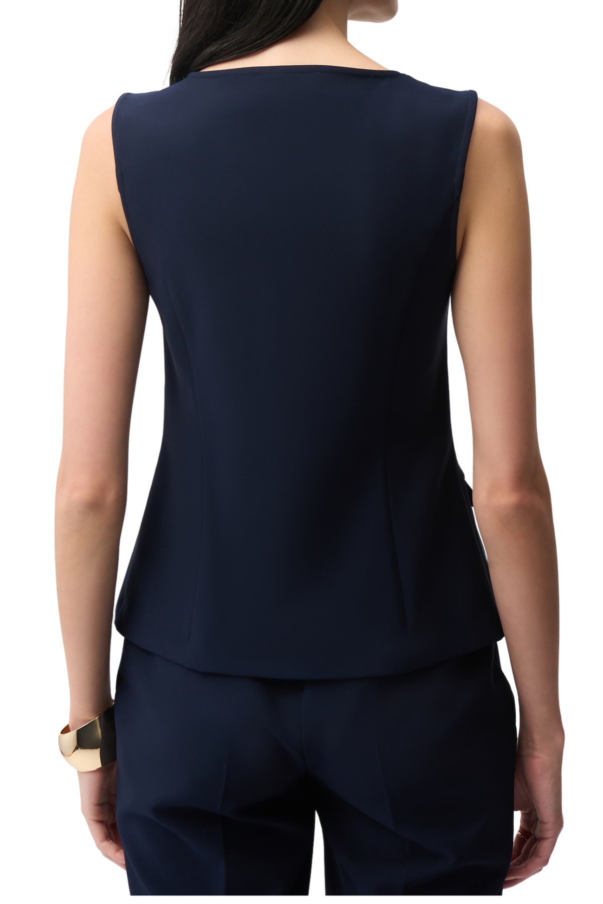 Tailored and modern, this lux twill sleeveless vest features a scoop neckline, princess seams, a two-way front zipper, and decorative flap details.