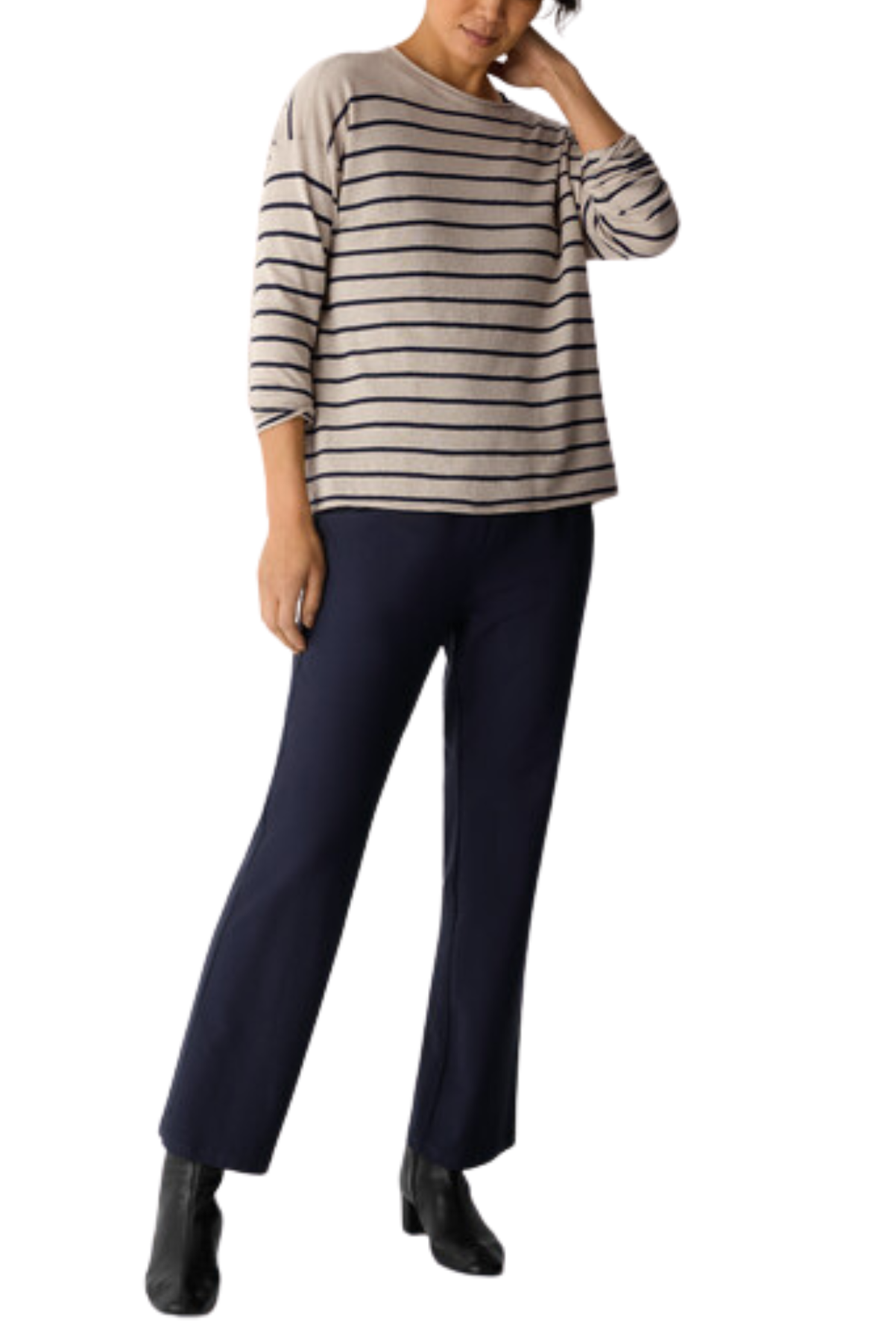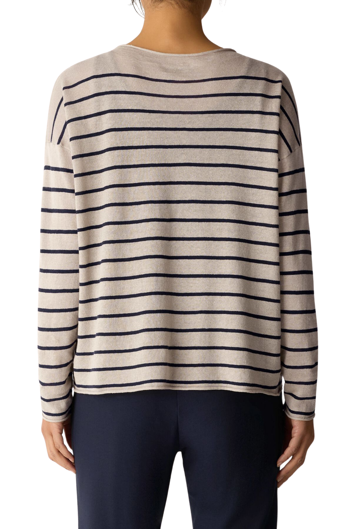 The jewel neck top. An effortless layer set apart by sophisticated stripes, in a textural blend of organic linen and cotton.
