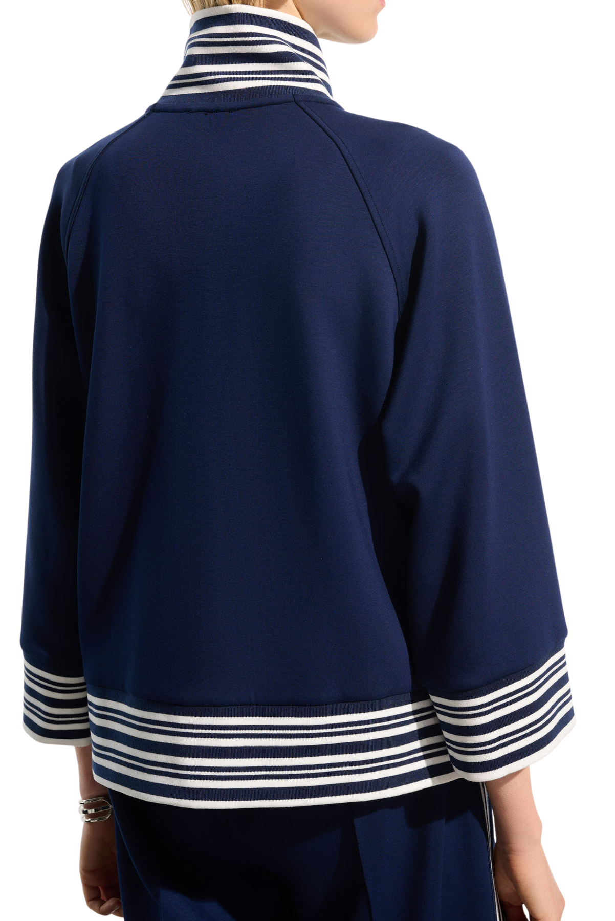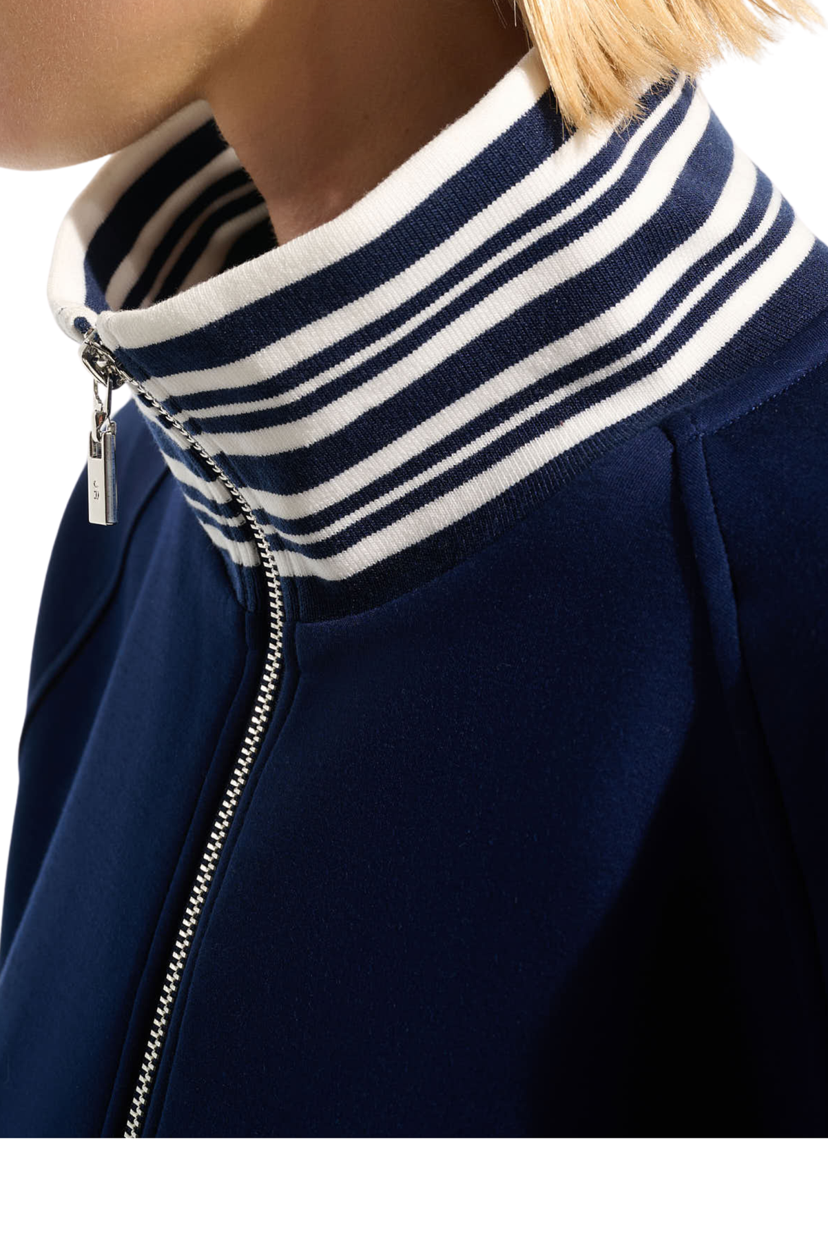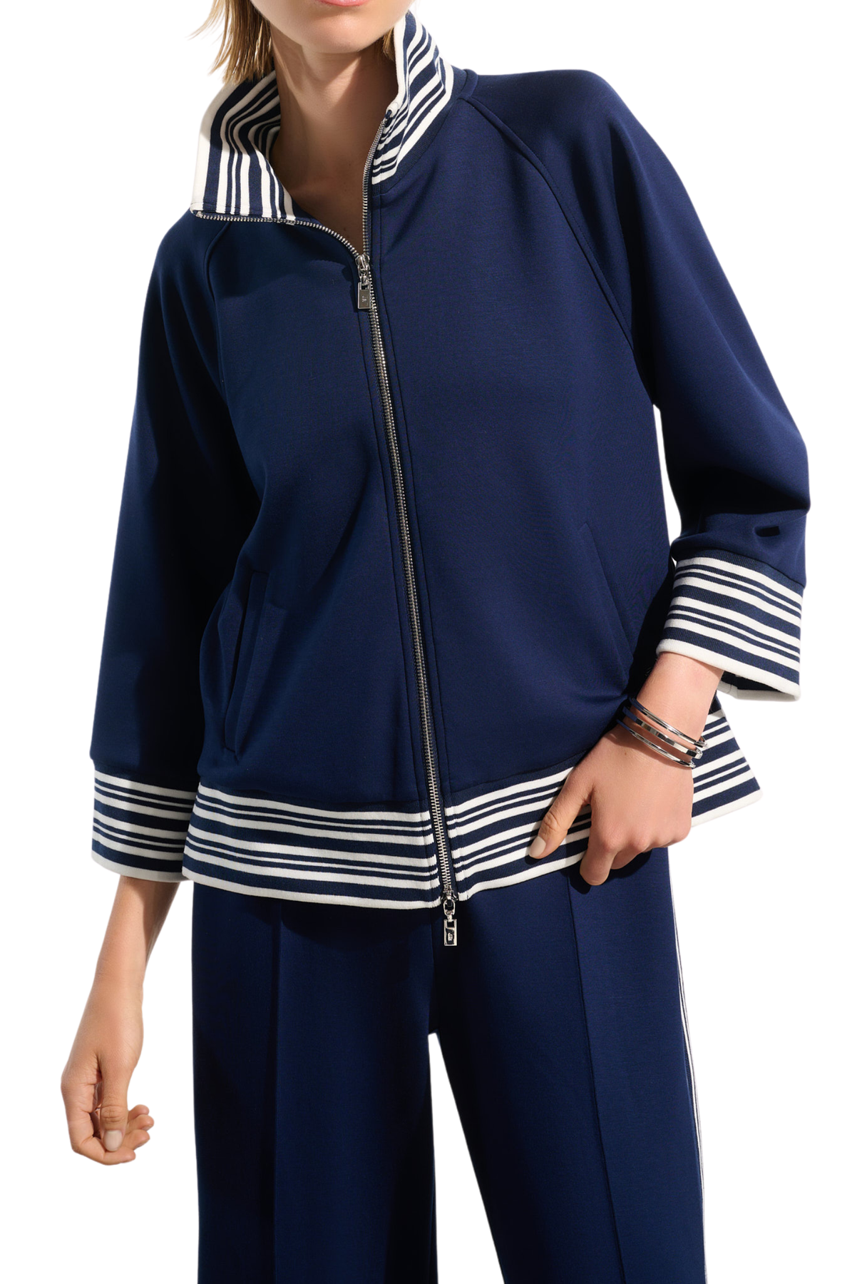 This scuba jersey jacket blends sporty flair with polished edge. Featuring a metallic front zipper, striped rib trim and three-quarter raglan sleeves, itβs made for easy layering without compromising style.