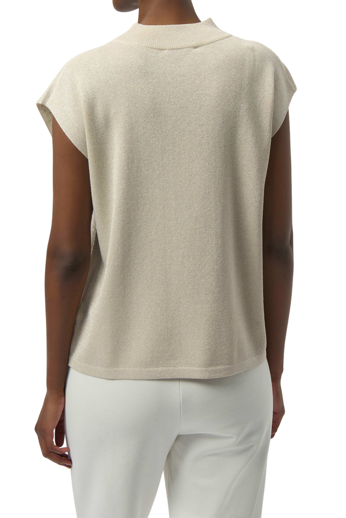 This versatile sleeveless pullover is a chic addition to your occasion wardrobe, featuring a sophisticated mock neck and elegant iron-on detailing. Crafted from a soft sweater knit in a flattering straight fit, it pairs beautifully with a variety of bottoms for a polished look. Sweater knit, mock neck, sleeveless.