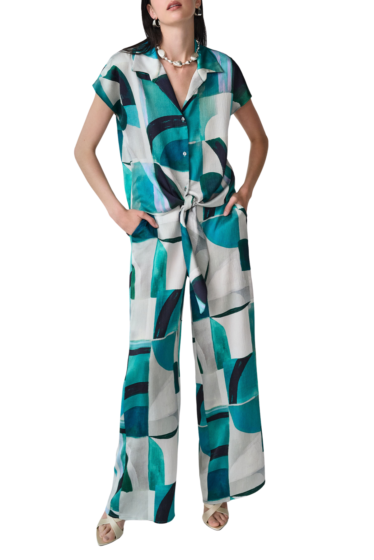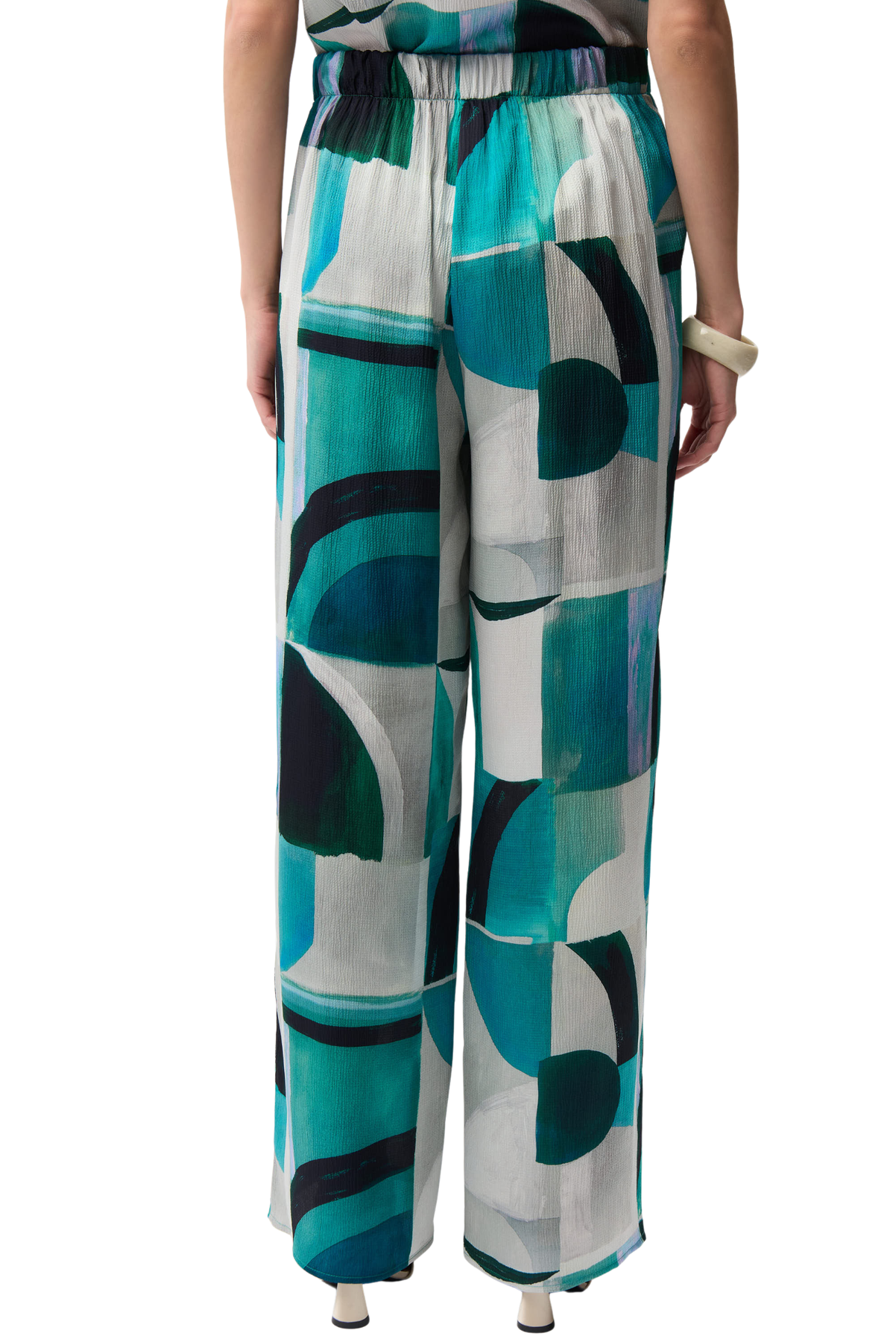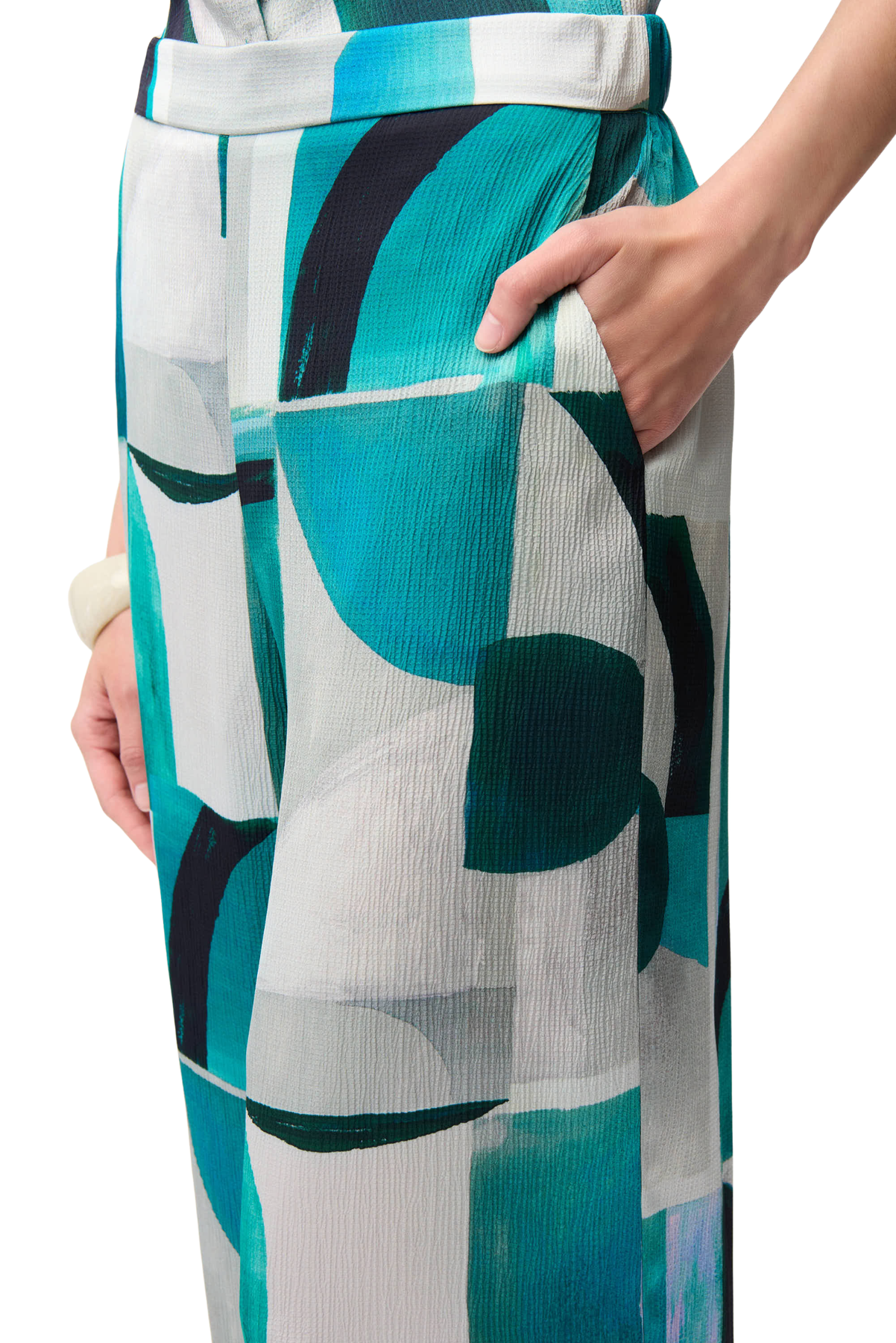 Modern and bold, these textured satin pants feature a geometric print, wide legs, a folded front waistband with elastic at the back, and convenient side pockets.