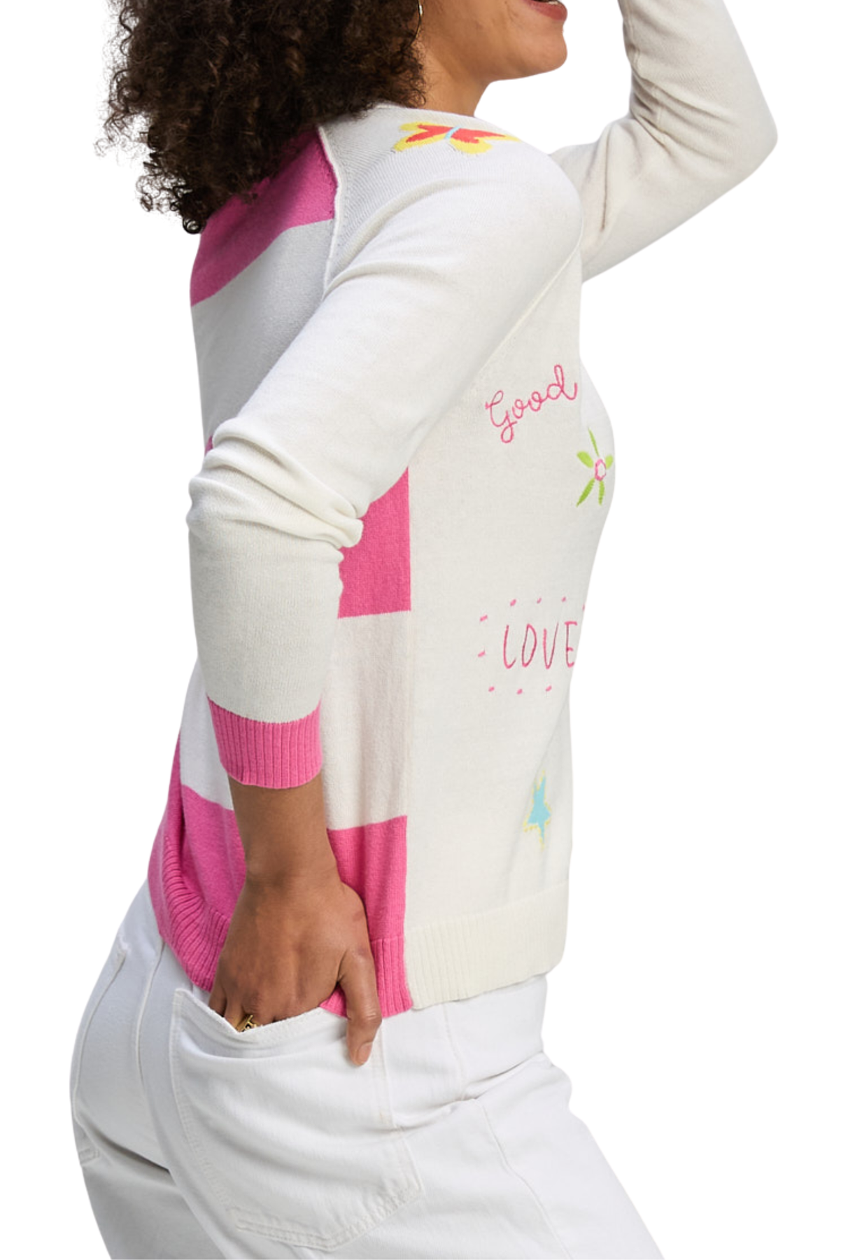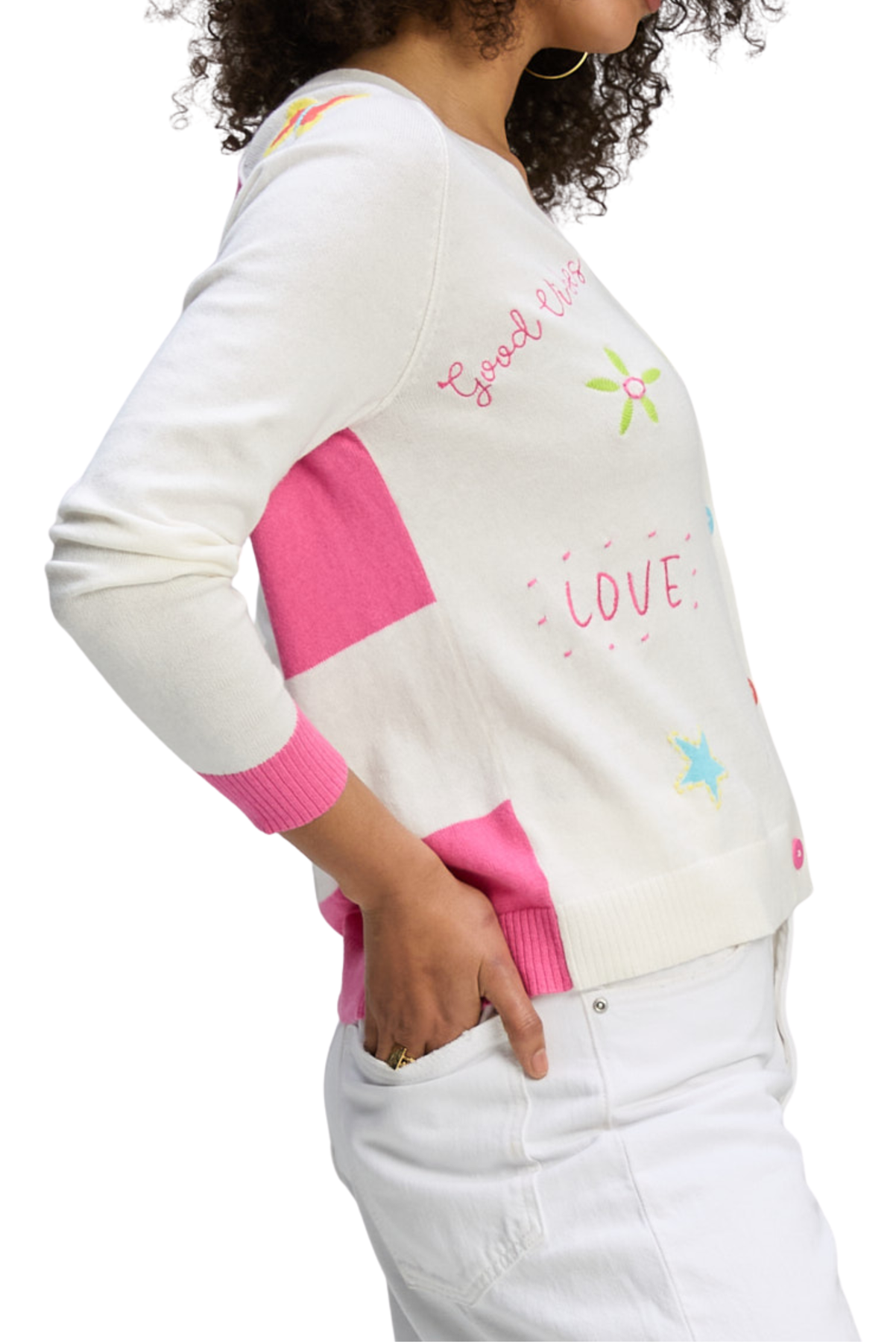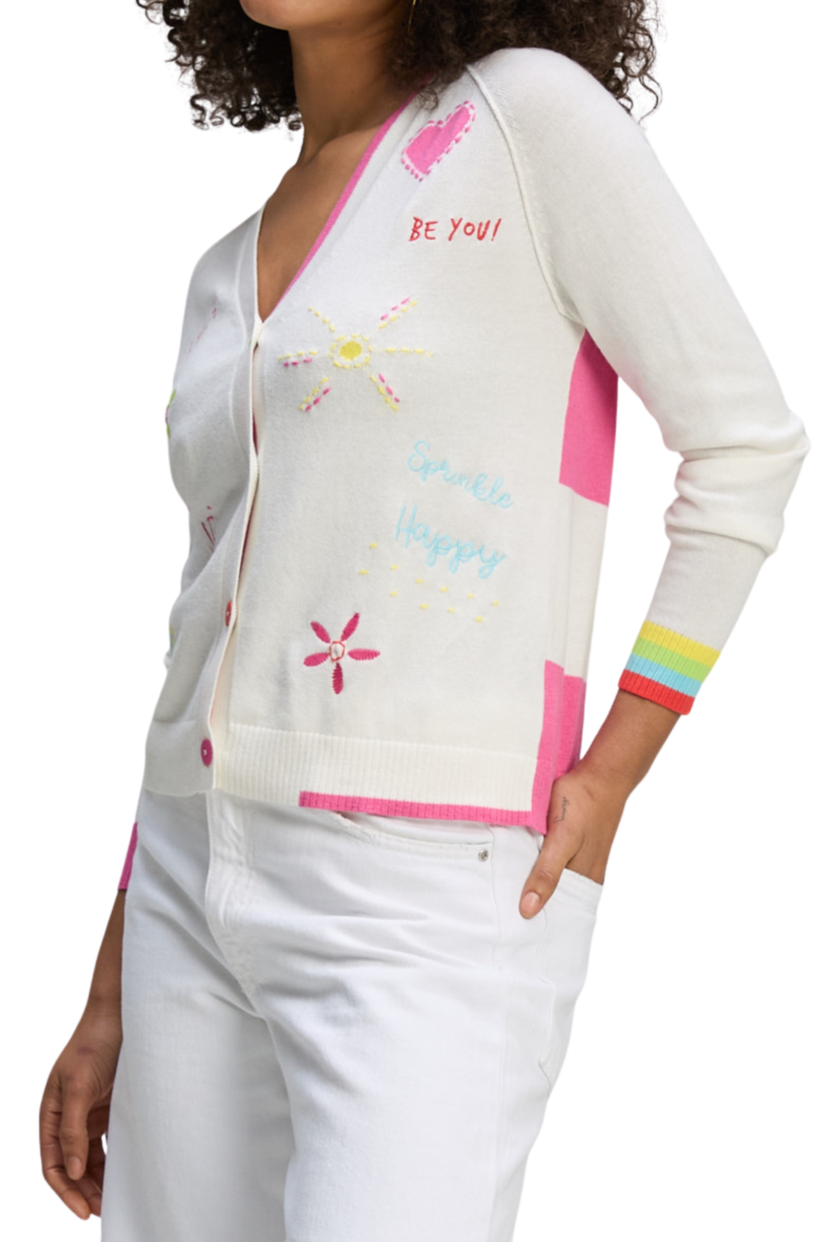 A playful white cardigan with a button-front design, featuring colorful stitched motifs, contrast trim, and cheerful detailing. A lightweight statement layer that adds fun to everyday looks.