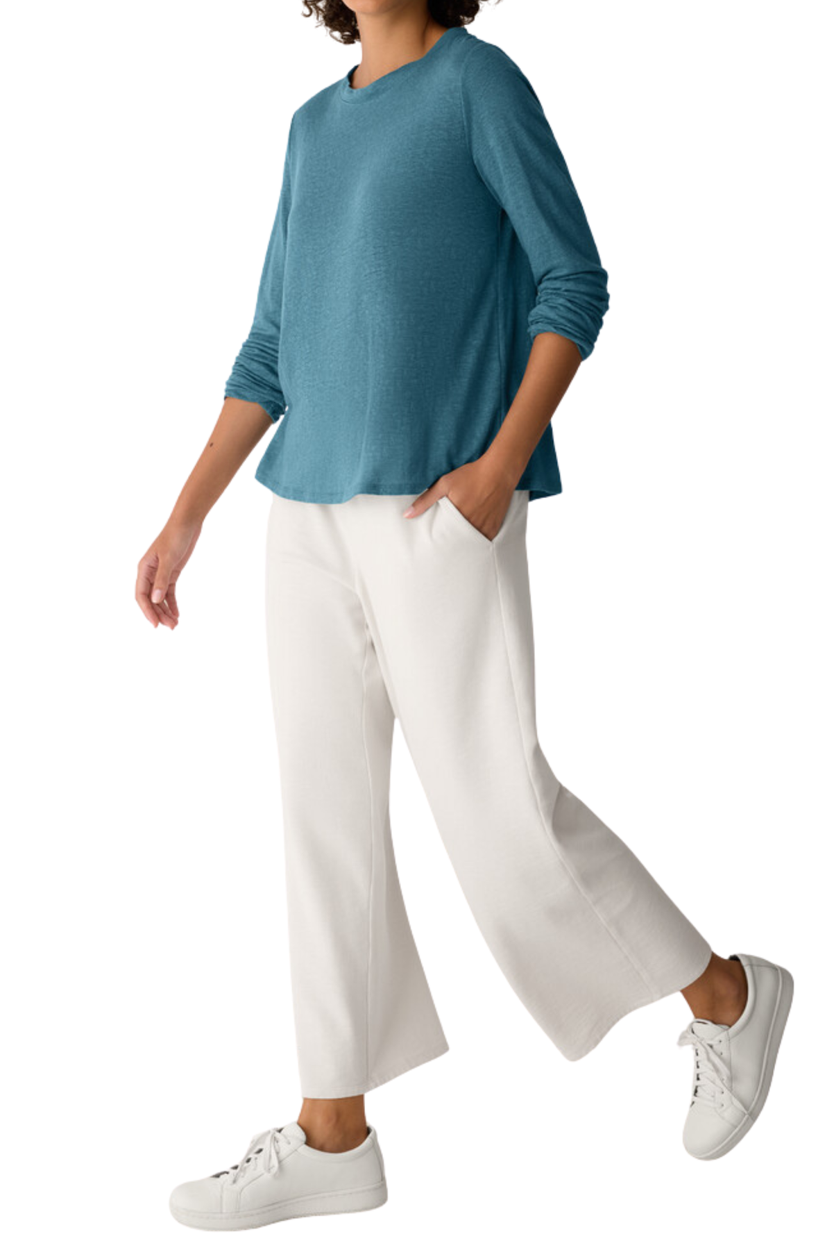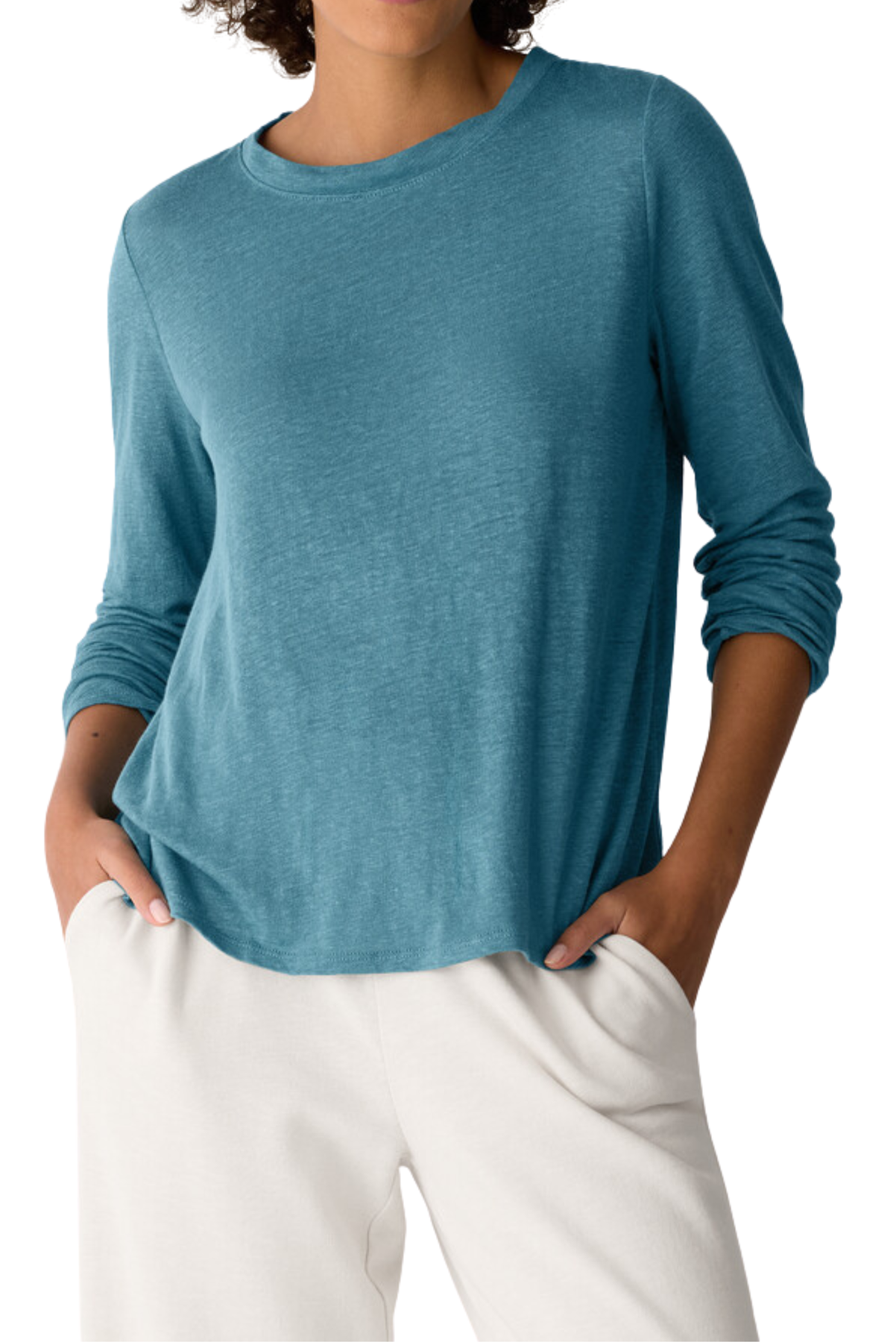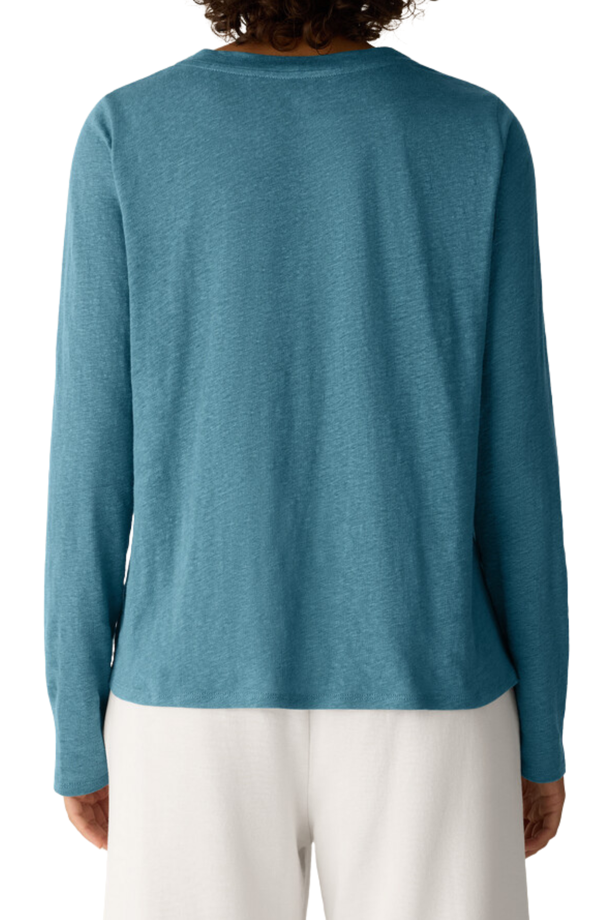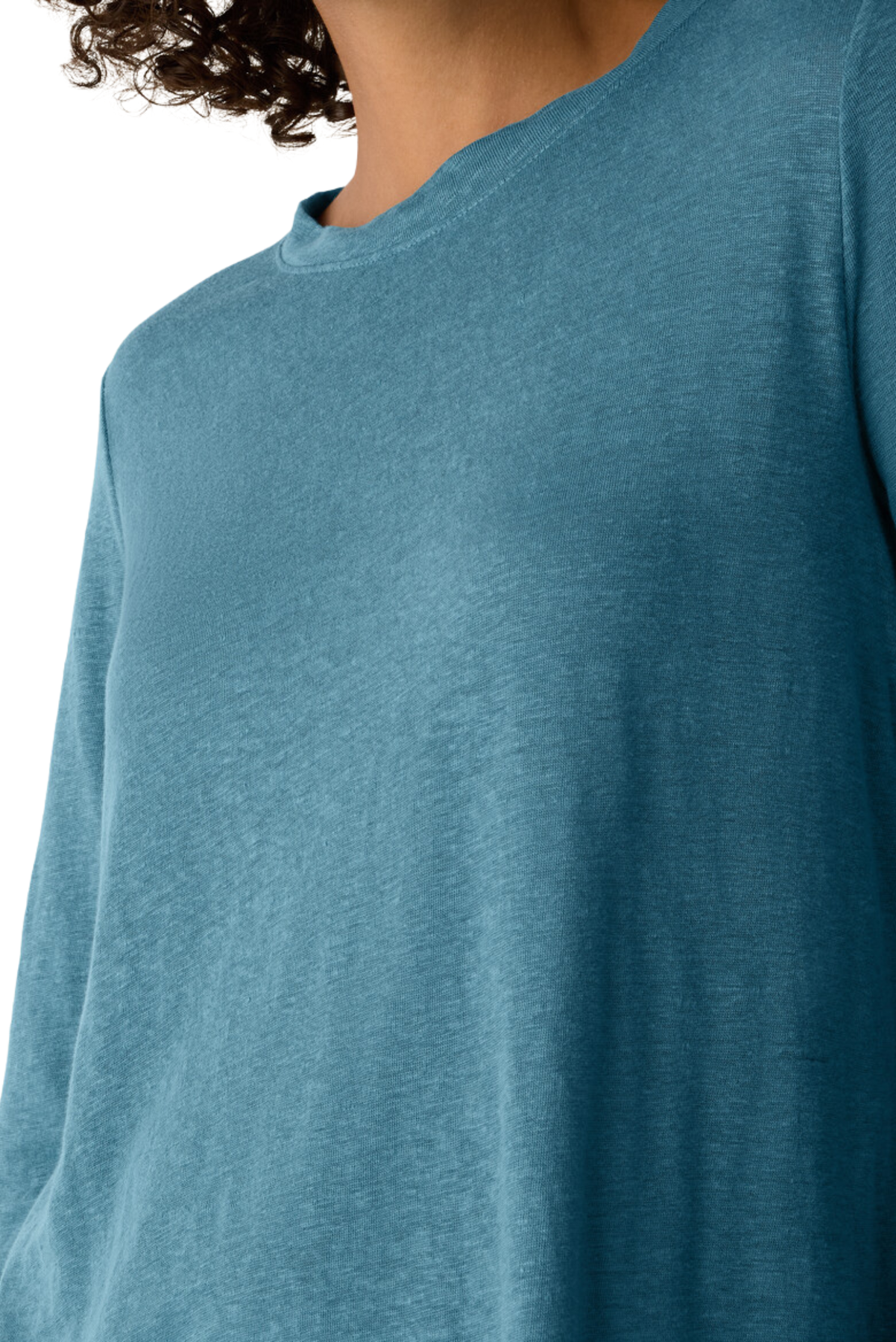 An elevated basic with a crew neck and long sleeves. In our signature Organic Linen Jersey, lightweight with subtle texture, finished with banding at the neck. Close at the shoulders, wider at the hem. A silhouette that fits the body with ease. Crew neck, long sleeves. Finished with banding at the neck.