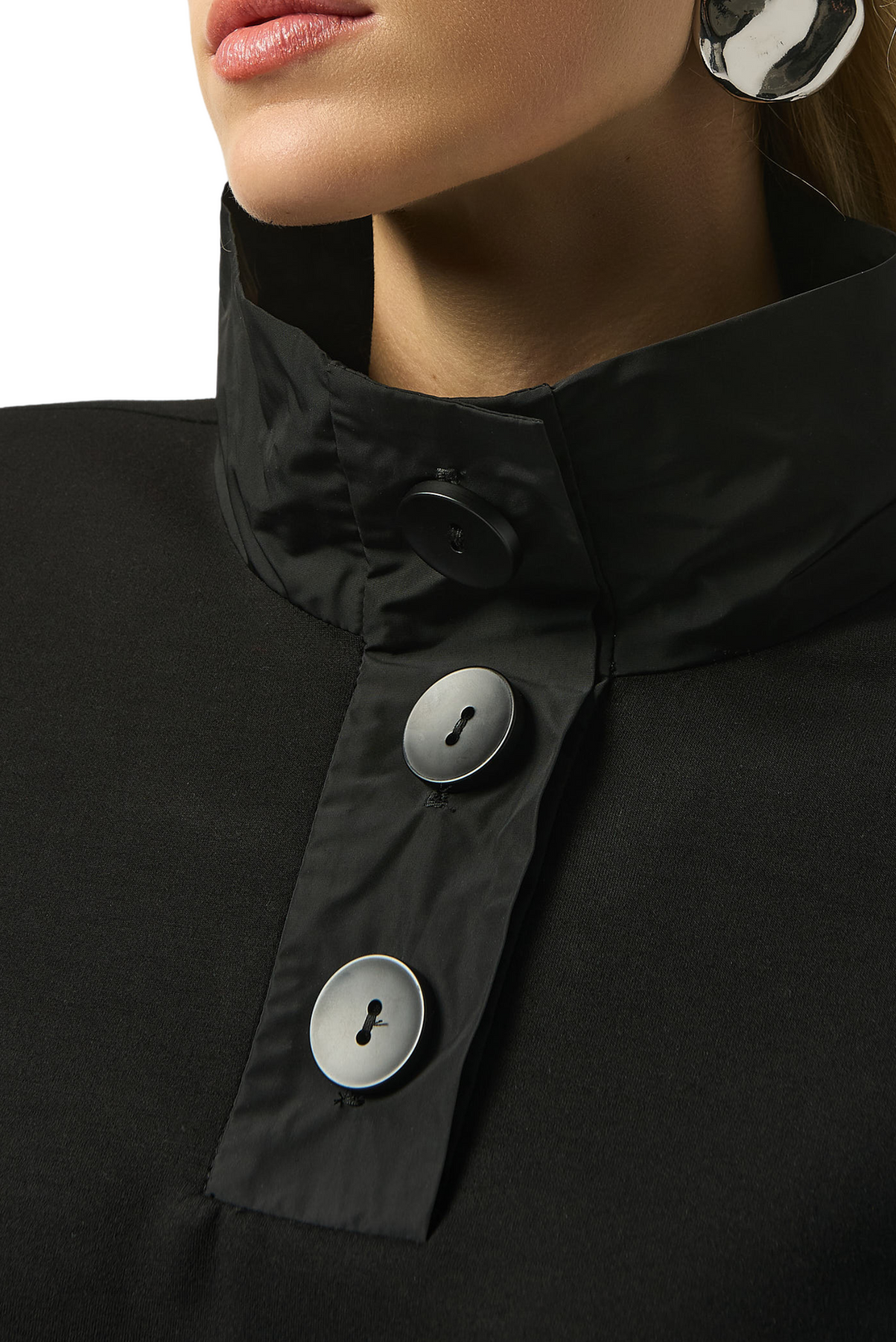 Embrace the unparalleled style of this scuba jersey top. The piece boasts a funnel collar with sleek placket detail and long straight sleeves, that create a perfectly chic look. The boxy silhouette, adorned with a front button closure, captures the essence of contemporary flair.