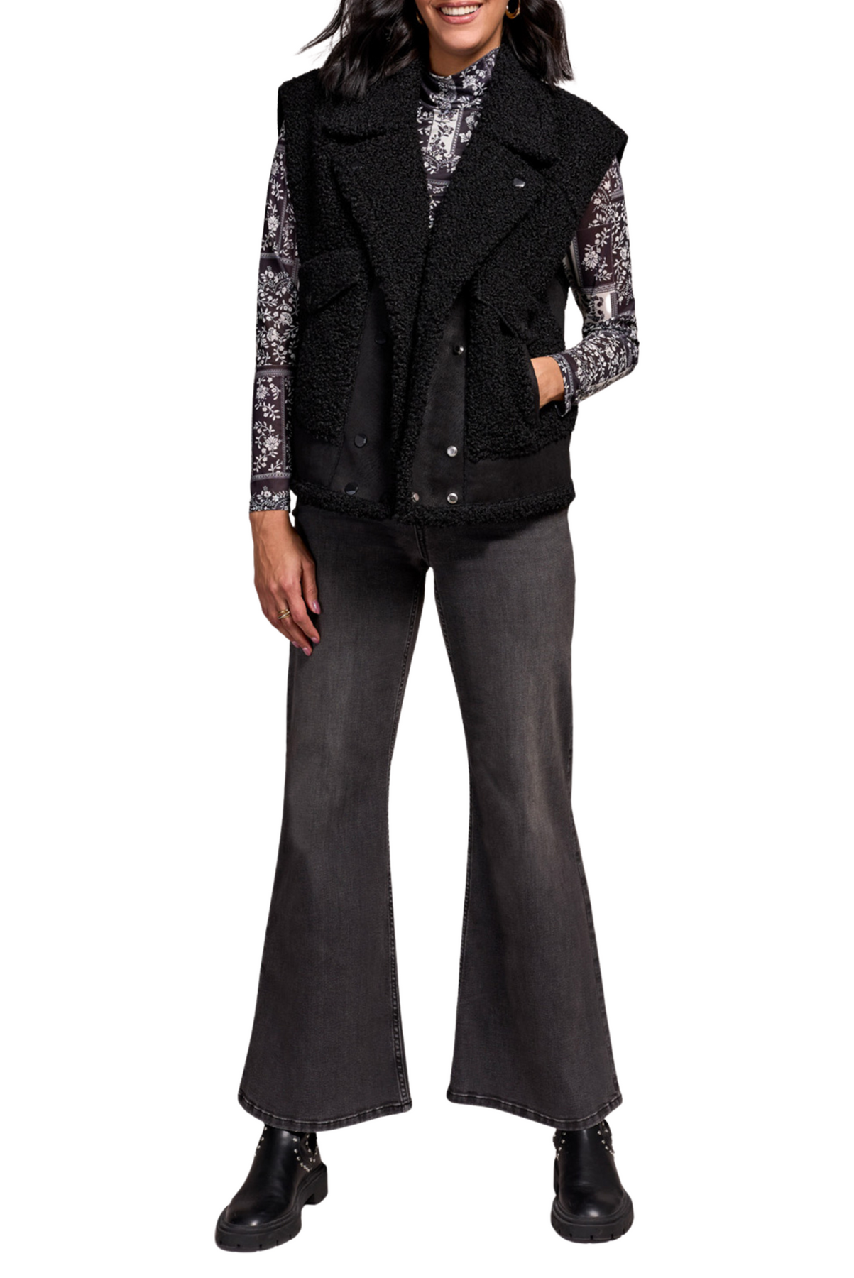 Exude comfort and sophistication in this faux sherpa vest featuring an oversized notch collar embellished with snaps. The sleeveless design layers in a cinch, and the cushy shearling fabric makes it oh-so-soft while adding style points. It's completed with snap front closures, a 25" length, functional welt side pockets, and decorative flap-top patch pockets on the chest.